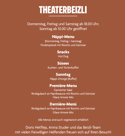 Bevor wir Sie mit unserer Darbietung auf der Theaterbühne begeistern dürfen, laden wir Sie herzlich ein, unsere kulinarischen Angebote zu kosten. Unter der Leitung von Doris Hetflejs, Anina Studer und dem Beizli-Team mit vielen freiwilligen Helfenden haben Sie, je nach Datum, die Möglichkeit, ein Premièren-Menü, unseren legendären Theater Zmorge, unser "normales Menü" oder das Dernièren-Menu zu geniessen.